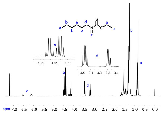 On the other hand, the efficient removal of the xanthate group was also proved with the recuperation of the carbamodithiate, which is an important by-product of the aminolysis reaction. The hexylamine attacks the carbonyl thio of the xanthate group, producing two rotamers of O-ethyl hexylcarbamothioate (See Scheme 2). The 1H NMR spectrum (See Figure 2) reveals two quartets at 4.48 and 4.40 ppm, “e”, corresponding to the methylene group attached to the oxygen. The hydrogen from the amine “c” appears at 6.53 and 6.12 ppm. Two quartets corresponding to the methylene attached to the amine “d” at 3.46 and 3.18 ppm are also observed. These compounds have not been previously reported as by-products of the aminolysis reaction. This type of compound has been obtained in cress extracts [25]. Thiocarbamates are also described as additives in insect repulsive agents [26].