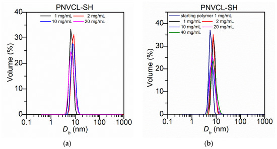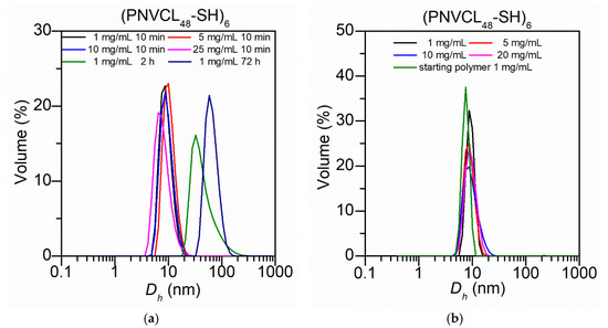 On the other hand, the behavior of linear PNVCL-SH polymers in THF solution is very different from that of star-type polymers. The change in the hydrodynamic diameter is practically negligible even when varying the concentrations of polymer in THF solution (Figure 5a). With respect to polymers dissolved in water at different concentrations, the behavior is like that of star-type polymers. The Dh remained practically unchanged (Figure 5b) in all polymer samples. For clarity, only data taken at 72 h are shown.