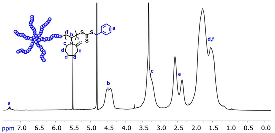 The 1H NMR spectrum for the (PNVCL-trithiocarbonate)6 star polymer is shown in Figure 7. At 7.33 ppm a multiplet peak is observed that corresponds to aromatic hydrogens, and its presence proves the efficient functionalization of the trithiocarbonate group in the polymer.