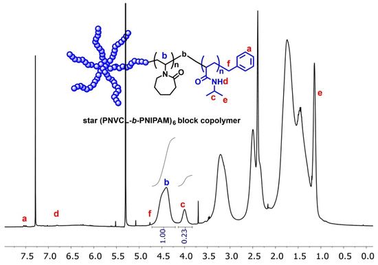 1H NMR spectrum (400 MHz) in CDCl3 of the (PNVCL-b-PNIPAM19%)6 star block copolymer (Mn GPC = 47,320 g/mol, Ð = 1.27).