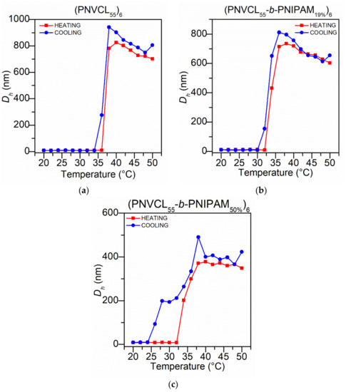 DLS measurements (c = 1 mg/mL in water), evolution of the Dh as a function of the temperature for (a) (PNVCL55)6 star polymers (Mn GPC = 46,120 g/mol, Ð = 1.12), (b) (PNVCL55-b-PNIPAM19%)6 star block copolymers (Mn GPC = 47,320 g/mol, Ð = 1.27) and (c) (PNVCL55-b-PNIPAM50%)6 star block copolymers (Mn GPC = 49,100 g/mol, Ð = 1.32). The red line represents the heating cycle and the blue line represent the cooling cycle. Heating and cooling rate: 1.0 °C/min.