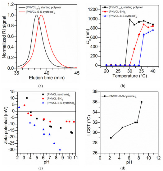 In Figure 11a, the chromatograms of the polymer functionalized with L-cysteine and the starting polymer are shown. As can be seen, the GPC curve for the star PNVCL-S-S-Cys sample is unimodal and is shifted to longer retention times with respect to the starting polymer. Once functionalized, the end-chain polymer has amino and carboxyl groups (by arm) that contribute to its retention in the column. In addition, the molecular weight of the (PNVCL-S-S-cysteine)6 star polymer was apparently increased (Mn GPC = 43,560 g/mol, Ð = 1.22) with respect to the starting xanthate polymer (Mn GPC = 29,200 g/mol, Ð = 1.24, Table S1, entry 4).