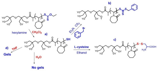 After aminolysis of the RAFT-made polymers, several examples prove the successful reactivity of thiol chain-end, e.g., with isocyanates [7], with 2,2,-dithiodipyridine [8] and cholesterol functionalization with alkyl iodides [9].