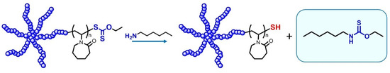 Based on the literature, the reaction for the removal of the RAFT group by aminolysis can be carried out in times ranging from seconds to several hours [20,21,22,23]. RAFT-made polymers containing a xanthate group are very susceptible to hydrolysis [20] or oxidation [21] compared to those with trithiocarbonate [22], especially in the case of methacrylate-type polymers [23].