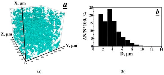 Three-dimensional image X-ray computed microtomography of a porous structure in the volume of a polytetrafluoroethylene sample (a) and the histogram of the size distribution of pores (b).