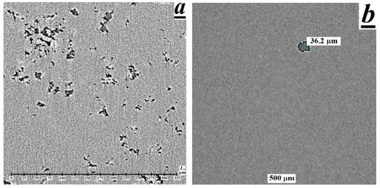 The subsequent thermal-radiation modification of PTFE leads to an almost complete disappearance of pores (Figure 2b). Several large pores with sizes from 20 to 50 μm can be observed in the sample volume, which indicates the dissolution and/or coalescence of pores in the process of thermal-radiation modification of PTFE. In this case, the gases contained inside the pores are released from the polymer melt into the environment [].