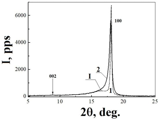 Diffraction patterns of the (1) initial and (2) thermal-radiation-modified polytetrafluoroethylene samples in the range of diffraction angles 2θ = 5–25°: (I) is the diffuse diffraction maximum at 2θ = 10–25° and 002 and 100 are the meridional and equatorial reflections of polytetrafluoroethylene, respectively.