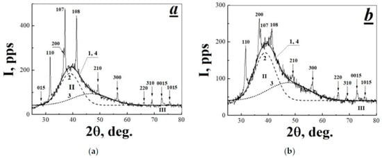 High-temperature radiation modification has no significant effect on the properties of PTFE X-ray spectrum. Diffraction patterns of the initial polymer and TRM-PTFE in the range of diffraction angles 2θ from 5 to 80° contained 13 and 12 Bragg peaks, respectively, as well as three haloes in the ranges 2θ = 10–25° (I), 25–70° (II) and 72–75° (III) (Table 1, Figure 3 and Figure 4a,b).