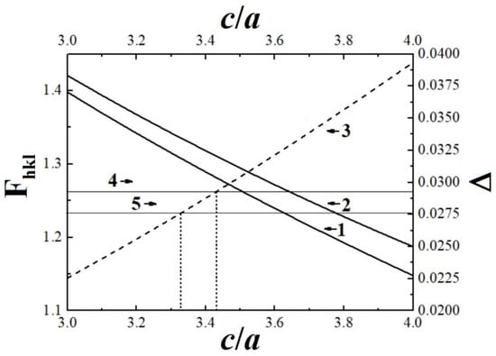 Here, the difference between interplanar spacings for reflections 0015 and 1015 does not depend on the lattice constant a. The graphical solution of Equation (3) is the so-called Hull-Davey diagram, which is a log-lin plot of the parameter F = 4(h2 + hk + k2)/3 + l2/(c/a)2 as a function of the ratio c/a (Figure 5) [,]. Then, the point of intersection of the straight lines corresponding to the difference Δ = 2log(d0015) − 2log(d1015) for the initial polymer and TRM-PTFE with the dependence describing the difference F2 − F1 on c/a will determine the desired ratio of the lattice constants of PTFE (Figure 5, curves 3–5, Table 2).