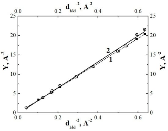 The lattice constant a can be determined from the slope of the dependence Y = [(4/3) × (h2 + hk + k2) + l2/(c/a)2] ¤ 1/dhkl2 (Figure 6). It was found that the thermal-radiation modification of PTFE leads to an insignificant increase in the lattice constant a by ~0.1 Å and to an insignificant decrease in the large lattice constant c also by ~0.1 Å (Table 2).