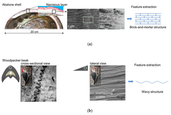 Biomimetic microstructures. (a) The typical microstructures of the nacre (adapted from Ref. [7]); (b) the typical microstructures of the woodpecker beak (adapted from Ref. [26]).