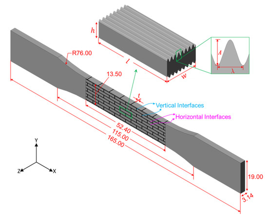 Geometric design of the hybrid bio-inspired structures in accordance with ASTMD368 standard and the unit-cell geometry of the samples with horizontal wavy interfaces.