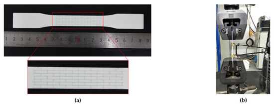 (a) A typical 3D-printed sample for tensile testing; (b) experimental setup for quasi-static tensile tests.