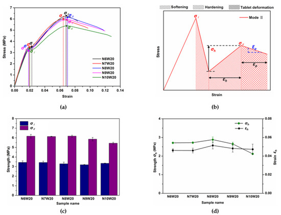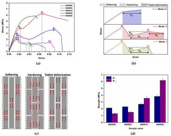 In addition, Figure 8d shows the relationship between the failure mode of the composites and the structural feature. Through the above analysis, we can come to a conclusion that the key to high toughness of the composites lies in the balance of two failure mechanisms: soft phase failure and tablet break. The soft phase failure helps to increase the fracture strain and improve the energy absorption, making the failure of the composite show pseudoplasticity, while the tablet break can improve the bearing capacity (i.e., the strength and stiffness) of the composite before its failure.