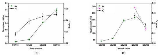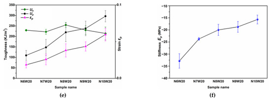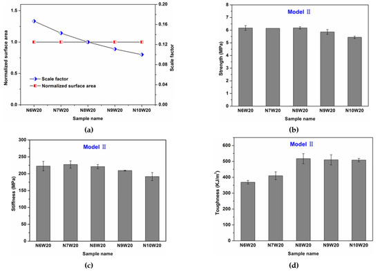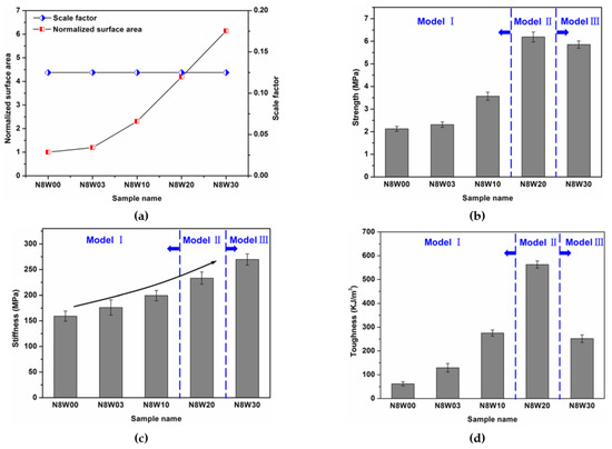 Figure 5a shows the normalized surface area (normalized by the surface area of composite N8W00) and the scale factor (defined as λ/w) of composites for various tablet waviness, Figure 5b–d show the strength, stiffness and toughness values of composites with different waviness. Obviously, the stiffness increases as the tablet waviness increases, which can be attributed to the increase in contact interface. Compared with the stiffness of composite N8W00 (159.09 MPa), the stiffness of composite N8W03, N8W10, N8W20 and N8W30 increases by 10.6% (175.98 MPa), 25.2% (199.14 MPa), 46.6% (233.17 MPa) and 69.4% (269.55 MPa), respectively. However, there is indeed an optimal structure design based on the geometry and mechanical properties of the constituents under the circumstance of strength and toughness. Among all composites, composite N8W20 has the highest strength (6.2 MPa) and toughness (562.8 KJ/m3), which are 191.3% and 811.0% higher than that of composite N8W00. Interestingly, the increase in toughness of our nacre-like composite is obviously higher than that of other reported nacre-like composites [15,16,17,18,19,21]. Although the strength of composite N8W30 is slightly lower than that of composite N8W20, there is a sharp drop in the toughness of composite N8W30 compared with composite N8W20 due to smaller failure strain. This is essentially attributed the competition between interface hardening and stress concentration, which was also discussed by Horacio D et al. [16,18]. It should be noticed that the stiff phase volume in composites is not the same; composite N8W20 exhibits larger strength and toughness, although the stiff phase volume for composite N8W30 is higher than composite N8W20, which can be attributed to the wavy interface design.