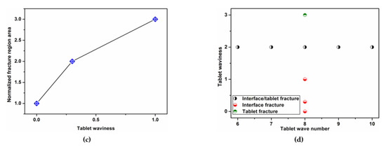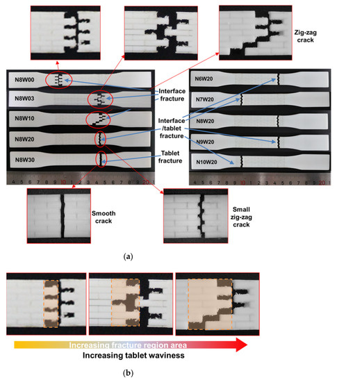 The typical failure patterns of the bio-inspired composites are shown in Figure 8a. The fracture patterns of the composites can obviously be divided into three types: the soft phase (interface) failure, the soft phase failure coupled with the tablet break and the tablet break. In composite N8W00, N8W03 and N8W10, soft phase failure in both the vertical and horizontal interface is the cause of the composite failure. Additionally, their zig-zag fracture path just proves that the shear deformation of soft phase during tablet sliding is the main mechanism of their energy absorption. Though similar fractures existed in composite N8W00, N8W03 and N8W10, we observed from Figure 8b that increasing the tablet waviness results in the increase in the fracture region area. Additionally, we quantified the fracture behavior of composites with tablet waviness below 2, as shown in Figure 8c. The increase in tablet waviness from 0 to 1 leads to an increase in the fracture region area up to two times. As discussed in Section 3.1.1, increasing the tablet waviness can improve the resistance of the composites to crack initiation and propagation. It can be seen from Figure 4a that the strain corresponding to the strength σI increases with the increase in tablet waviness, so the deformations spread to a larger area and cause tablet pullout in a larger region, as previous studies reported [15], leading to an increase in the fracture region of composite N8W00, N8W03 and N8W10.