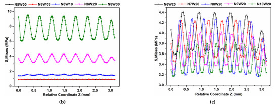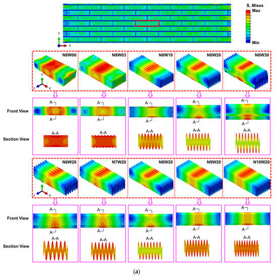 The tensile stress distribution in a tablet selected at the same position of different composites at the same overall tensile strain 0.65% (elastic deformation region) is displayed in Figure 9a. Firstly, an efficient stress transfer between the hard tablets and soft interface can be observed, thus the tensile stress in bricks is much higher than that in interfaces. It is evident that the stress is seen to concentrate in the center region of the tablets; specifically, the stress concentrates on the top of the wave in the wavy tablet surface. Therefore, as the waviness in tablets increases, the stress concentration area on the tablet surface gradually changes from a single, continuous one to multiple, discontinuous ones, but the total area of the stress concentration area is decreases. Notably, the number of stress concentration areas is the same as the wave number of the tablet when the waviness is not zero. In addition, the number of stress concentration area increases as the tablet wave number increases, however, the total area of the stress concentration area increases first and then decreases. Among all composites with different wave number but the same waviness, the ratio of the stress in the middle area of the tablet to that on the top of the wave in composite N8W20 is the smallest, which means that the tablet of composite N8W20 can withstand greater tensile deformation.