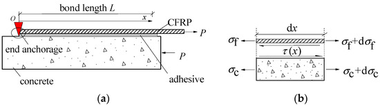 Single-lap shear test of CFRP-to-concrete bonded joints with end anchorage: (a) single-lap shear tests model; (b) Development of stress in CFRP–concrete joint.