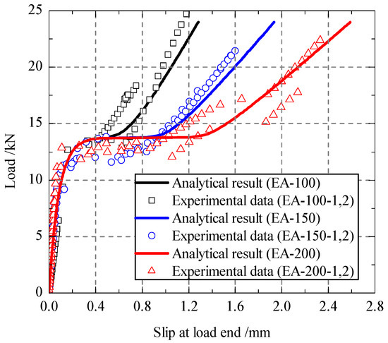 No obvious plateau stage for the joint with a bond length of 100 mm. Therefore, it is hard to get the bond failure load from the experimental curves. For the joints with a bond length of 150 mm or 200 mm, the bond failure load can be recognized as the peak load in the plateau stage, because the bond failure could cause a sudden drop of the load during the test. In Table 3, with the increasing of bond length, the analytical prediction Pd obtained by Equation (24) increases, i.e., 13.57 kN for 100 mm, and 13.75 kN for 150 mm. When the bond length exceeds the effective bond length (123 mm), the failure load Pd and the slip sd no longer increases with the bond length. According to the comparisons, the ratio of analytical prediction to experimental result is between 1.02–1.14, which indicates that the presented model in this paper has a satisfactory predicting accuracy.