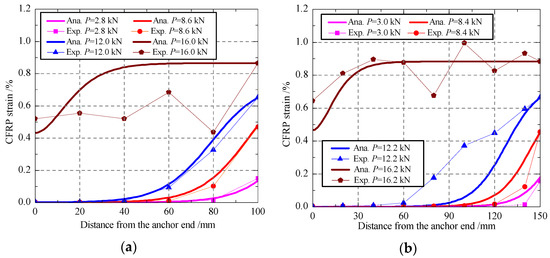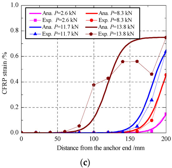 According to the presented analytical model in Section 2, the distributions of CFRP strain under different loads were calculated with Equation (16) and then compared with the measured data in the experimental program, as shown in Figure 11. Under an external load lower than the bond failure load, the analytical results are in a good agreement with the measured data. For a small load, there is generally no strain distribution in the vicinity of the anchor end, but the strain increases with the increasing of the distance from the anchor end. When the external load increases gradually, the CFRP strain near the loading end increases quickly until the bond failure load is reached. After the bond failure load, the strains do not change in a certain distance from the loading end to the anchor end, which indicates that the debonding failure happened and developed towards to the anchor end. At that stage, the strains near the anchor end grow very fast, and the strain distribution curve became nearly a straight line until the CFRP fracture. For the bond behavior in the stage after bond failure, the predictions of the proposed analytical have some deviations with the experimental results, which may be due to the effect of uneven high strain state and the dynamic process of interface debonding on the stain measurement. Generally, the presented model has a good prediction on the whole bond and debonding process of end anchored CFRP–concrete joint.