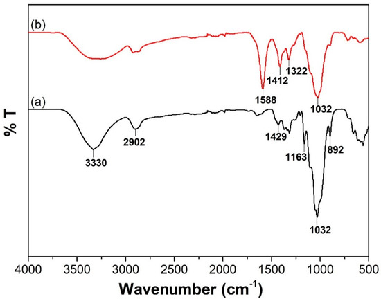 The purity of cellulose extracted from oil palm fibres was verified by FTIR analysis of the sample, as shown in Figure 2a. The bands between 1000 and 1500 cm−1 correspond to characteristic absorption of cellulose. The bands at 1429 cm−1, 1163 cm−1, 1032 cm−1, and 892 cm−1 are attributed to C-H bending and C-O-C stretching of β-linked glucose subunits. Upon carboxymethylation, a significant absorption band appeared at 1588 cm−1, which is assigned to the carboxyl group, thus verifying the transformation of cellulose into CMC (Figure 2b).