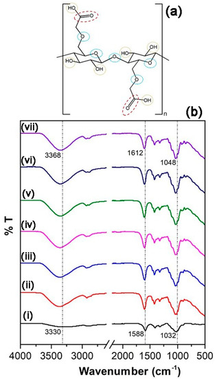 (a) Chemical scheme of possible complexation site in the polymer chain and (b) FTIR spectra of (i) CMC powder and CMC-LiI films with (ii) 5%, (iii) 10%, (iv) 15%, (v) 20%, (vi) 25%, and (vii) 30% glycerol content.
