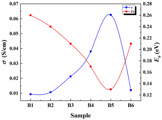 The Anderson–Stuart model defined that an ion within a matrix occur when the ion is equipped with enough energy to detach itself from a site and suffiecient kinetic energy to support its motion [33,34]. Thus, the activation energy is the main factor in influencing the overall ionic conductivity of a sample at any given temperature. With the increase of glycerol, Ea decreases up to a minimum with the addition of 25 wt %, followed by an increase of its energy. Figure 5 clearly shows that the ionic conductivity and Ea have an inverse relationship, where the conductivity is highest with lowest value of Ea at 65% salt and 25 wt % plasticizer. This result can be attributed to the presence of substantial amount of amorphous portions within the polymer film upon inclusion of salt and plasticizer, as depicted by XRD analysis, aiding in the mobility of ions via the transitional motion of the polymer chains contained within amorphous regions [35]. Selvasekarapandian and co-workers reported that the density of ions in the electrolyte increases with the increase in salt or glycerol content. Thus, the energy barrier for the proton transport decreases, leading to a decrease in the Ea value. These results are in agreement with the values obtained in this work.