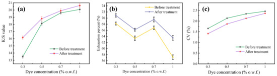 As seen in Figure 3a,b, the exhaustion of dye and the K/S value of the dyed fabric were 68.20% and 13.49, respectively, when the amount of dye concentration was 0.3% (o.w.f.). After oligomer extraction, the exhaustion of dye and the K/S value of the dyed fabric were 70.86% and 16.15, respectively. At a higher dye concentration, the effect of oligomers on dyeing depth and dye uptake has a similar trend. From these experimental results, washing away the oligomer on the surface of the polyester cloth sample has a certain effect on improving the dyeing effect. The removal of oligomers increased the dye uptake of disperse blue 366 by 3.25–3.71%. It is possible that the oligomer adsorbs some dyes, which reduces the amount of dye that the fabric can adsorb. From the K/S value of the dyed samples, the dyeing depth of cloth samples increased by 6–13% after oligomer extraction. The improvement effect is relatively good at low dye concentration. Therefore, the uptake of dye and the dyeing color depth have been improved after oligomer extraction. Obviously, the color uniformity of dyed polyester fabrics became better with the treatment in Figure 3c.