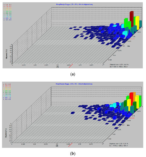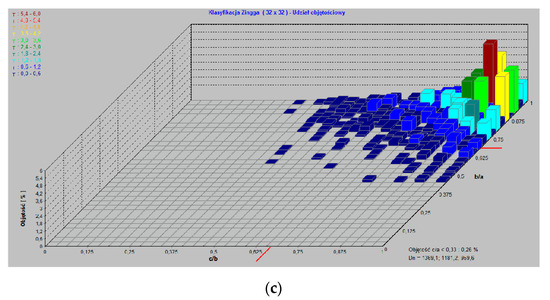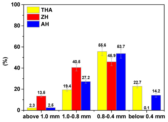 The superabsorbent polymers, THA, ZH and AH, used for the investigations are materials possessing carboxylic acid groups bound to the polymeric matrix. As it was presented in [28], they are characterized by large water absorption and different grain sizes. According to the Zingg clasification [29], more than 62% of hydrogel beads have a spherical shape. It was found that with an increase of bead size, the volume of the disc-shaped fraction decreased in favor of grains in the form of spheres. The obtained results are summarized in Table 7, and the exemplary volume shares of individual beads in the hydrogels are presented in Figure 4.