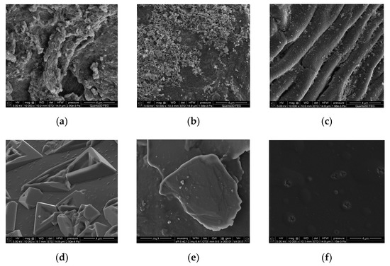 SEM scans of (a) THA, (b) ZH and (c) THA before the sorption process; after the sorption process of the Cu(II) complex with EDDS: (d) THA, (e) ZH and (f) THA.