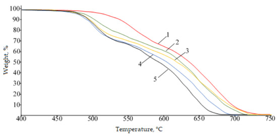TGA curves: 1—PPSU; 2—PPSU-C-30; 3—PPSU-C-50; 4—PPSU-C-70; 5—PPSU-C-100.
