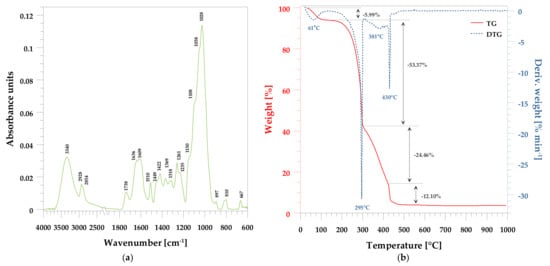 The characteristic vibration bands in the FT-IR/ATR spectrum (Figure 2a) of the peanut shell powder are shown in Table 2. The assignment of the bands is consistent with those given in many articles dealing with lignocellulosic material [10,22,27,32].