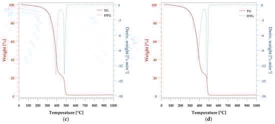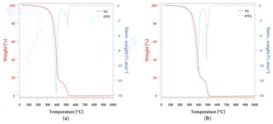 Real degradation takes place in the other stages. As shown in Figure 2b, the TG curve of peanut shell powder shows a significant loss in the temperature range of 190–500 °C. On the DTA curve, two peaks are visible at 295 and 430 °C. They could be attributed to the degradation of the hemicellulose (around 300 °C), cellulose (around 380 °C), and lignin (around from 200 °C to 500 °C).