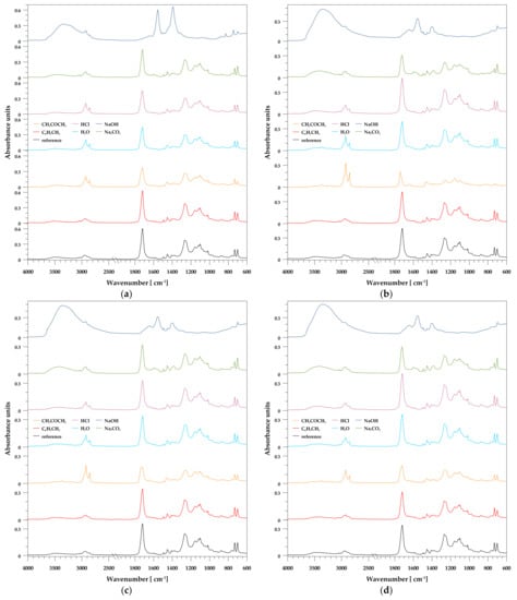 In Figure 4, the spectra of the UPR/PSP composites immersed in different chemicals are presented. After the immersion test in toluene, no spectral changes are observed. This solvent does not alter the chemical structure of the materials, neither the polymer matrix nor the filler. For the sample of unsaturated polyester resin, the band at 700 cm−1 is representative of styrene-benzene rings (aromatic -CH ring) and does not change during immersion because styrene cannot be hydrolyzed [33].