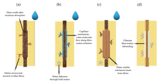Degradation during the immersion test. Effect of water penetration into the fiber–matrix composite: (a) Moisture sorption; (b) capillary mechanism; (c) substance leaching from fiber; (d) fiber–matrix debonding.