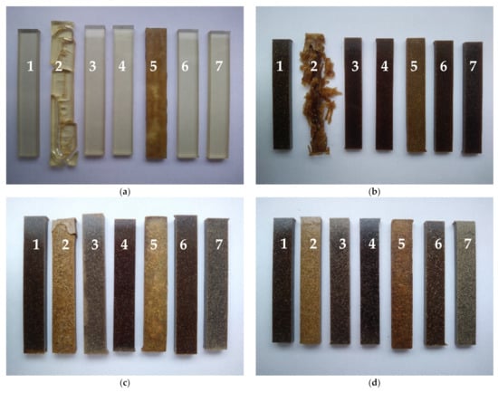 Images of the UPR/PSP composites before and after the immersion test: (a) pure UPR; (b) UPR + 10; (c) UPR + 20; (d) UPR + 30. Immersion test liquid standard: 1—reference sample (before test); 2—acetone; 3—distilled water; 4—HCl; 5—NaOH; 6—toluene; 7—Na2CO3.