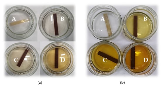 Images of the UPR/PSP composites during the immersion test. The color change of alkaline aqueous solution after: (a) 7 days; (b) 140 days. A—pure UPR; B—UPR + 10; C—UPR + 20; D—UPR + 30.