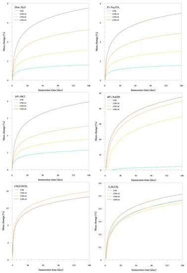 Figure 8 shows the relationships between the mass of the studied composites and their immersion time. Except for acetone, the resin itself hardly changes weight even after 140 days of immersion. For this solvent, partial delamination and exfoliation appeared after just one day (Sample 2 in Figure 6b). The smallest mass changes for both the resin and the composites were found in toluene. In general, all composite samples are characterized by similar behavior in the aqueous solutions, starting with an initial rapid absorption followed by a gradual increase until equilibrium is reached. At any of the similar time intervals, composites containing higher filler loading exhibited larger water absorption.