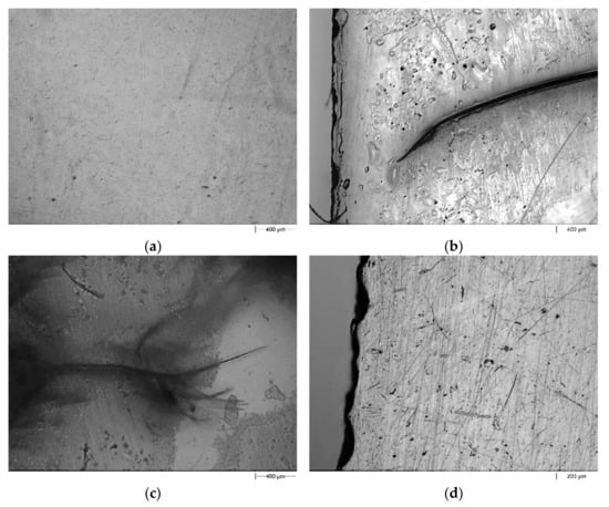 Morphologi 3G microscope images of the pure UPR before (a) and after (b–d) the immersion test. (a) Reference sample; (b) CH3COCH3; (c) NaOH; (d) Na2CO3.