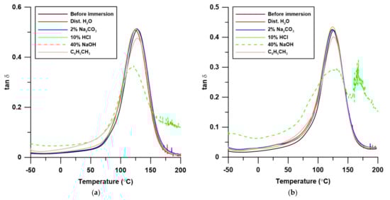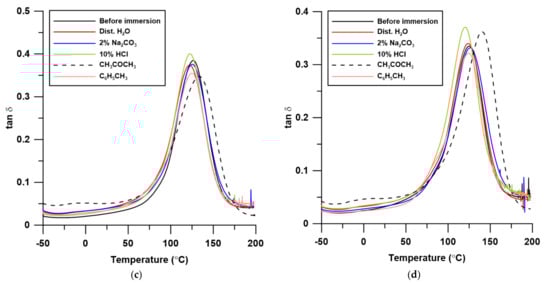 In Table 5, the numerical data of thermomechanical studies of these composites before and after the immersion test are presented, while Figure 11 shows the curves for the dependence of the damping factor on the temperature. The samples that were not damaged or distorted during the immersion were analyzed.