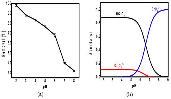 The pH value of solution is a critical factor affecting the adsorption behavior [37] specially for Cr(VI) ions. Therefore, the pH effect on the adsorption of Cr(VI) on the surface of ppy/NC nanocomposite was studied at pH ranging from 2 to 8 as shown in Figure 3. According to Figure 3a, the ppy/NC nanocomposite showed the highest removal efficiency for Cr(VI) ions at pH value of 2 (98%) while this removal efficiency was decreased gradually by increasing pH value until reached its lowest efficiency at pH 8 (32%). These results of pH effect on the adsorption could be interpreted according to the ionic behavior of chromium ions at different pH as illustrated in Figure 3b.