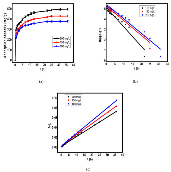 To study the contact time effect on the adsorption of Cr(VI) on the surface of ppy/NC nanocomposite, the adsorption capacities were studied at different time intervals from 0 to 35 h using different initial concentrations of chromium ions as shown in Figure 5a. According to Figure 5a, the first 3 h showed a rapid increase of the adsorption capacity followed by a slow increase of this capacity until it reached the equilibrium. The rapid increase of adsorption capacity during the first hours could be attributed to the availability of large number of active sites for the uptake of toxic ions [41]. After that, there was a slow increase in the adsorption capacity due to the repulsion between already adsorbed ions on the adsorbent and the other ions until reach the equilibrium at which the adsorbent surface becomes saturated, and the time does not have a significant effect on the adsorption capacity.