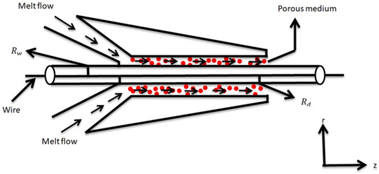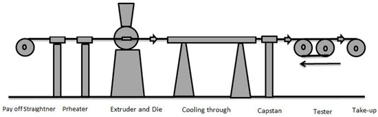 Many of the fluids that engineers and scientists interact with are Newtonian fluids (e.g., air, water, oil). However, in many circumstances, the foundation of Newtonian behavior is non-rational and complex, necessitating the development of non-Newtonian responses. Non-Newtonian fluid behavior can be found in a variety of fluid materials, such as glue, custard, paint, blood, and ketchup. Many studies have emphasized the importance of non-Newtonian fluids because of their wide variety of engineering and industrial applications [1,2,3,4,5,6,7,8]. Rahman et al. [9] investigated non-Newtonian nanofluids in arterial supply through compounded stenosis. Eyring–Powell fluid, first proposed in 1944 by Eyring and Powell, is one such fluid. Several characteristics of Eyring–Powell fluids have been studied [10,11,12,13,14]. The wire-coating procedure is critical for preventing injuries and reducing the damage caused by machine vibration. Various melt polymers are used to coat wire in industries. In most cases, two techniques are needed to coat wire. In the first step, melt polymer is continuously dropped on the wire, and in the second step the wire is dragged through a die soaked with viscoelastic material. The coaxial process, dripping method, and electrostatic deposition process are the three processes utilized for wire coating. The dipping phase in the wire-coating process creates a considerably stronger link between the continua, but it is slower than the other two operations. Figure 1 depicts the geometry of the wire-coating procedure. A payoff device, straightener, heating element, extrusion device and die, cooling device, capstan, tester, and pull reel are all included. The bare wire is wrapped on the payoff device that goes through the straightener, while the wire is heated via a preheater, and a nozzle die contains a classical die where the molten polymer is assembled and coated. After that, the coating wire is chilled by a cooling unit, then passed through a capstan and a tester before being wound on a take-up reel. Various non-Newtonian fluids have been used by numerous investigators to examine coating processes [15,16,17,18,19,20,21,22,23].