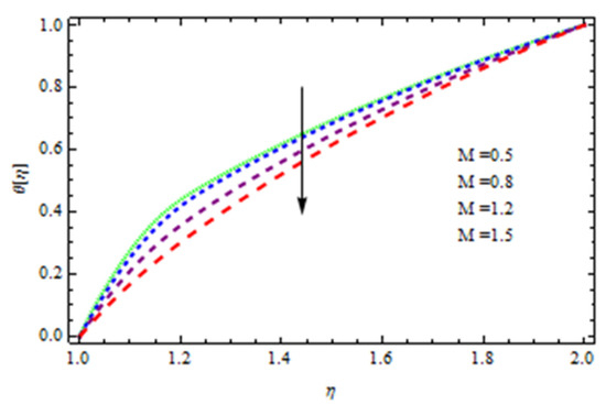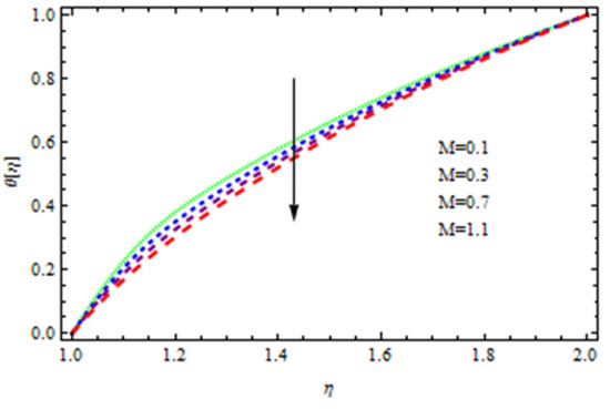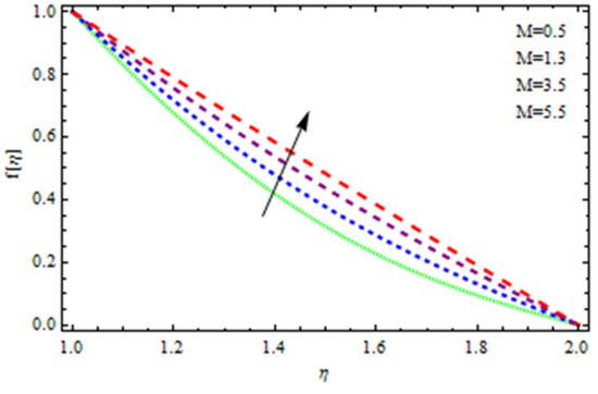 Magnetohydrodynamics deals with highly conductive flow characteristics in the applied magnetic field. Many scholars have dedicated a significant amount of time to the study of magnetohydrodynamic flow problems [24,25,26,27,28,29,30]. Due to its Lorentz force, an applied magnetic field produces a current that has a significant impact on fluid motion. The fluid moment is reduced due to this Lorentz force. Magnetohydrodynamics has recently gained prominence as a research issue due to its widespread application in a variety of industrial processes, such as magnetic field material processing and glassmaking.