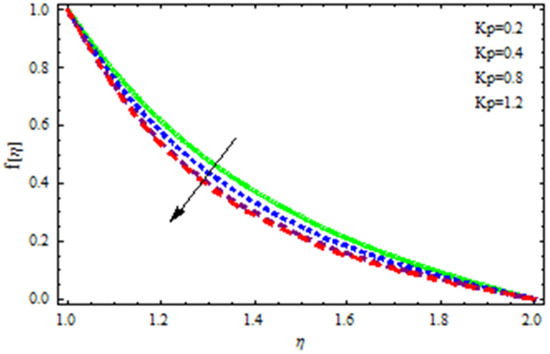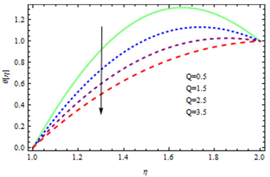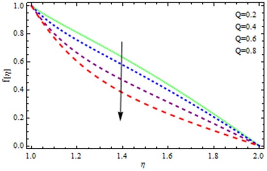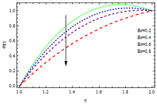 An EP (Eyring–Powell) fluid was examined for wire surface coating in this study. In a porous medium, wire coating usually happens inside a die with persistent magnetic and heat emission effects. We examined the effects of numerous development parameters, including and which stand for the non-Newtonian parameter, heat-producing parameter, viscosity parameter, variable-viscosity parameter, porosity parameter, and the Brinkman number, respectively. Furthermore, the effect of two other parameters, and , are also discussed as they relate to velocity and temperature distributions. Keeping and fixed, Figure 3 shows the effect of on velocity distribution in the absence of variable viscosity. The velocity significantly decreased with increasing . Ignoring variable viscosity and keeping other parameters fixed, Figure 4 shows the effect of increasing ɛ on the velocity distribution. With increasing ɛ, the velocity profile shows an increasing tendency. The influence of on velocity distribution is displayed in Figure 5. In the figure, the velocity profile increases as the parameter M increases. The impact of on the velocity distribution in the Reynolds model is shown in Figure 6. The Brinkman number (Br) is a dimensionless parameter used during melt processing to describe the conduction of heat from a barrier to a moving viscous fluid. With increasing , the velocity profile increased as well. This is attributed to the increased thermal power produced by viscous dissipation, which increases the fluid temperature and, as a result, increases the buoyant force. As a consequence, increasing the buoyant force causes the velocity to increase as well. When β0 = 0.2, M = 0.6, Br = 0.1, Q = 0.1, and m = 0.3, Figure 7 depicts the effects of the permeability parameter on the velocity in the case of the Reynolds model. As Kp increased, the velocity inside the die decreased. It is self-evident that the existence of a porous material generates greater fluid dynamic restriction, causing the flow to decline. As a result, as the impermeability factor increases, the barrier to flow velocity increases, and therefore velocity falls. Figure 8 shows the effect of N on the velocity profile for the Reynolds model. The growing action caused by a rise in N is eliminated by the velocity curve. Figure 9 illustrates that in Vogel’s model, the velocity of the fluid exhibits an increase with increasing Br, with M = 0.1, Kp = 0.6, and Q = 0.6. In Vogel’s model, the velocity curve in Figure 10 depicts an increasing tendency with increasing D. Figure 11 shows the tendency in the velocity distribution as Q increases in the case of Vogel’s model, with D = 0.3, M = 0.1, and Br = 0.5. When M = 0.5, Kp = 0.6, and N = 0.02 in the case of constant viscosity, Figure 12 illustrates the fluctuations in temperature distribution caused by ɛ. With increasing ɛ, the velocity profile shifted downward. The influence of the Brinkman number (Br) on the temperature curve with constant viscosity is shown in Figure 13; the dimensionless temperature profile falls as the dimensionless factor Br is increased in Figure 13, implying that this parameter enhances the wall temperature more than the mean temperature. This is because the fluid flow transports relatively less energy nearer to the borders in comparison to the core area, which may be the result of greater temperatures near the wall area. With viscosity and all other parameters held constant, Figure 14 shows the impact of Q on the temperature profile. With increasing Q, the fluid velocity shows an increasing tendency. Figure 15 shows an increasing behavior of the temperature field as the value of ɛ increases, in the case of the Reynolds model. In Figure 16, as M increases, the temperature profile increases as well. For the Reynolds model, the temperature profiles show an increasing behavior as M increases. By applying a perpendicular magnetic field to an electrical conductor fluid, a Lorentz force is created. The resulting Lorentz force has the capacity to eliminate fluid velocity in a confined geometry while also causing a temperature increase. As a result, increasing the value of the magnetic field parameter causes the thickness of the thermal boundary layer to develop, but the speed in the flow direction drops. With increasing Q, the temperature curve shows a decreasing behavior in Figure 17. In the case of Vogel’s model with D = 0.5, Kp = 0.2, and Q = 0.6, Figure 18 shows that the temperature inside the die increased due to impedance in M. Figure 19 illustrates that increasing Ω led to a declining temperature trajectory in Vogel’s model with N = 0.3, β0 = 1.2, Kp = 0.2, and D = 0.5. The influence on the streamlines of various values of Br with uniform velocity is shown in Figure 20. Figure 21 shows the impact on streamlines of different values of Br in the case of the Reynolds model. Figure 22 shows how streamlines are affected by the variation of Br in Vogel’s model.