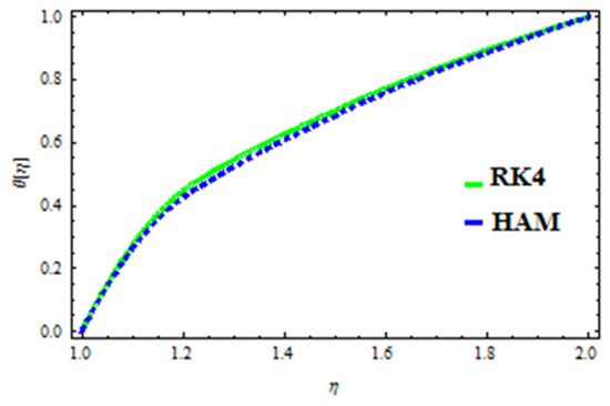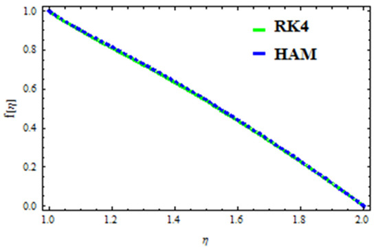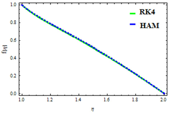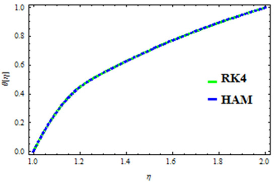 A HAM approach was used for confirmation of the results. As demonstrated in Figure 23, Figure 24, Figure 25, Figure 26, Figure 27 and Figure 28, we had excellent agreement using this method. This comparative study was carried out for three different scenarios: constant viscosity, Vogel’s model, and Reynolds’ model. In addition, as shown in Table 1, the residual was calculated. The current results were also validated with the published work of Hayat et al. [11] to ensure the accuracy of our findings. This analysis revealed that our results obtained for the stated model parameters were in remarkable conformity, and we are sure of the veracity and flexibility of our conclusions.