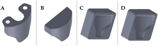 Steps followed during the design of the mold cad model, starting from: (A) the actual part, (B) making the solid block, (C) Cavity extrusion on Mold part, (D) Surface-optimized Mold.