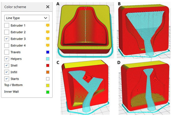 In the second case (Figure 3B), the mold is placed vertically onto the build platform, leading to a time increase of 5% compared to the previous condition, but the staircase-effect problem was significantly improved. As a drawback, many supports were generated, meaning a waste of material and a poor surface finish on supported surfaces. Overall better mold finish quality could be achieved with the use of soluble supports at the expense of a significant price increase for the creation of the mold. Moreover, the result in case 3 (Figure 3C) was similar to the previous case, but the generation of supports was reduced, and the staircase-effect was still present at some points. Finally, the printing position used in the fourth case (Figure 3D) minimized the generation of supports and allowed the maximum resolution of the curvature of the mold.