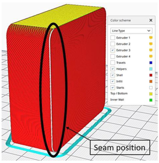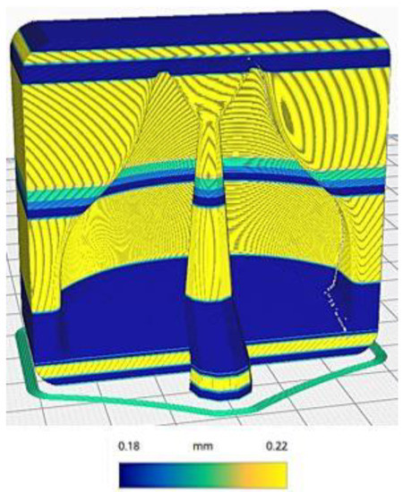 However, the settings on Table 1 were adopted to further improve the quality of the mold before the chemical smoothing process to reduce possible imperfections in the cavity. The seam of the outermost wall was preferentially positioned in the rear corner of the mold to avoid seams in the cavity, as seen in Figure 4. Thereafter, it was decided to use a variable layer height, as seen in Figure 5, to further improve the fidelity of the curvature, whilst speed up the printing process at the same time. The molds were not 100% filled; a 20% Gyroid type infill approach with three contour lines were used. This allowed us to obtain molds that could withstand the vacuum lamination process and minimize the material used.
