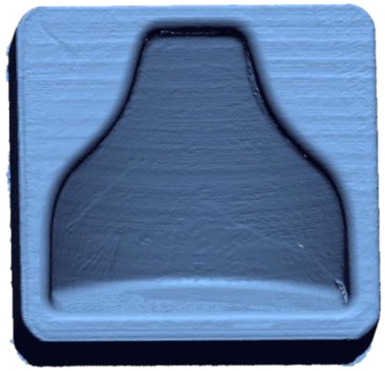 A Faro 3D scanner was used to check the fidelity of the printed model compared to the designed CAD file. In Figure 7 it is possible to see the cloud of points obtained from the scanning of the first mold. In order to evaluate the reproducibility of this process, two molds with the same gcode were printed. Therefore, a comparison with the theoretical, CAD file could be appreciated in Figure 8, in which the matching was good altogether, as an absolute range of 0.05 mm was obtained in most of the mold. There were areas on the inner boundary highlighted in blue where the matching was not accurate. Nevertheless, the results shown how accurate the printing process was. On the other hand, the overall printing precision could be improved. A so-called loop optimization could be carried out to obtain greater fidelity with the cad file. It could be noticed that although the staircase effect was reduced to a minimum, its effect persisted at some points, where the differences between the cad file and the printed model were higher.